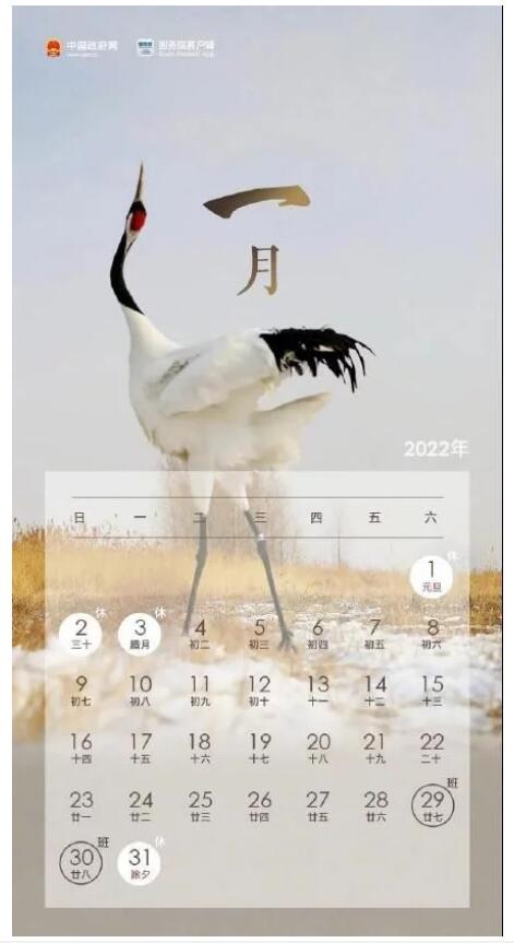 二、春节:1月31日至2月6日放假调休,共7天。1月29日(星期六)、1月30日(星期日)上班。